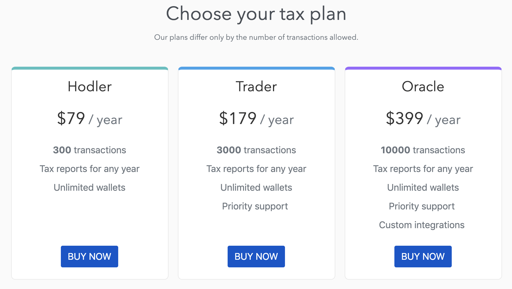 When evaluating any product, one of our primary considerations is price. Identifying a crypto tax solution is no different here, and Koinly offers one of the simplest pricing options to be found in crypto tax products. It should be noted that you can connect your crypto accounts for free, and you will only need to pay up if you wish to export a tax report. The cheapest plan which is likely suitable for most, is $79/year for up to 300 transactions (also known as the Hodler tier). If you're an avid crypto trader you might be required to bump up to the Trader plan for up to 3000 transactions, or the Oracle plan for up to 100,000 transactions. These plans are generously priced relative to the rest of the space.