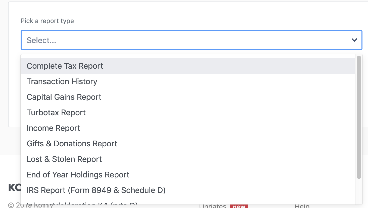 We're looking at this product primarily as a means to track and report or taxes. This is one of the things that Koinly does best. Here is a quick run down of the forms that are currently available for export at time of writing: Complete Tax Report, Transaction History, Gapital Gains Report, Turbotax Report, Income Report, Gifts & Donations Report, Lost & Stolen Report, End of Year Holdings Report, IRS Report (Form 8949 & Schedule D), Incomstdeklaration K4 (ruta D), Swiss Valuation Report.