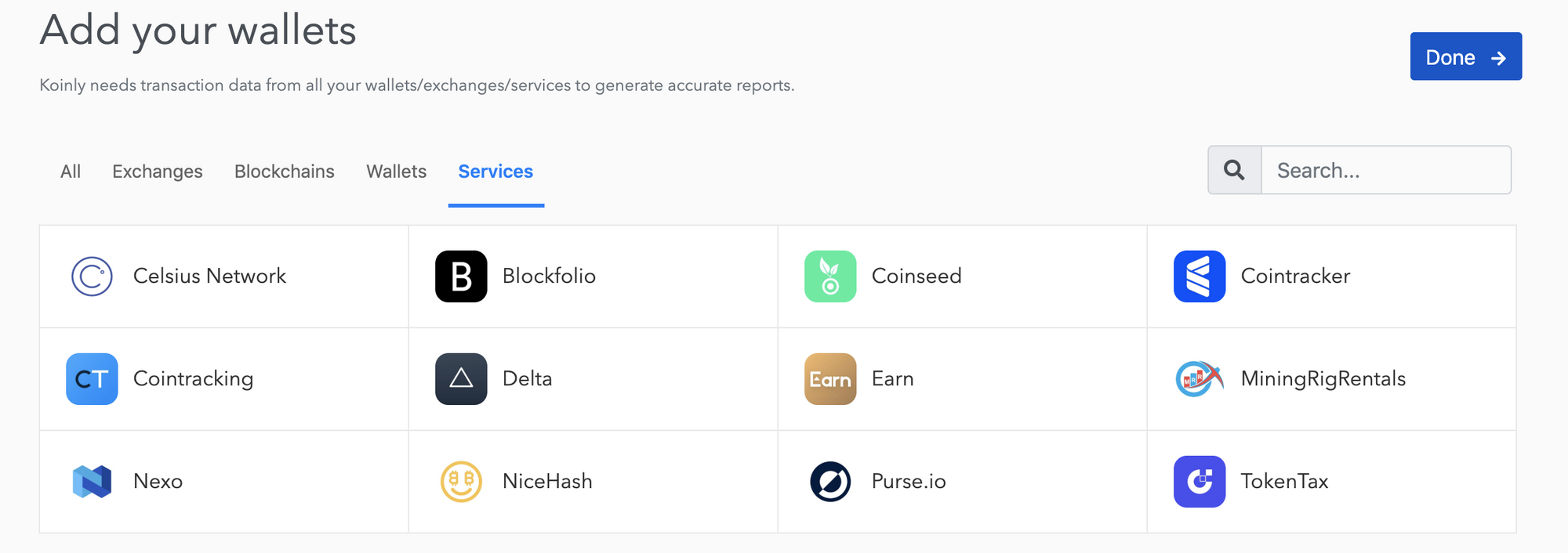 If you use other cryptocurrency services, Koinly may have support where other services do not. For example, Koinly offers support for Blockfolio which is a portfolio tracking tool. If you already have your crypto transactions/holdings captured there, Koinly can import them via CSV and catalog your transactions.
